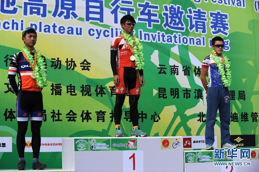 11月16日,获得昆明赛段长距离男子组前三名的中国“快闪”车队中华台北车手朱梵心(中)、阿提拉车队蒙古国车手巴山库(右)和中国快客车队车手徐鑫灵在颁奖仪式上。当日,“2014年七彩云南格兰芬多国际自行车节”在云南省昆明市鸣枪开赛。除了300余名参加全部五个赛段的选手外,还有700余名当地自行车爱好者也参与了昆明站的比赛。新华社记者胡超摄