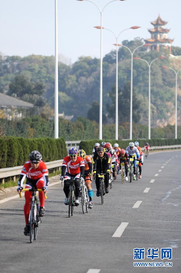 11月16日,选手们在比赛中骑行。当日,“2014年七彩云南格兰芬多国际自行车节”在云南省昆明市鸣枪开赛。除了300余名参加全部五个赛段的选手外,还有700余名当地自行车爱好者也参与了昆明站的比赛。新华社记者胡超摄