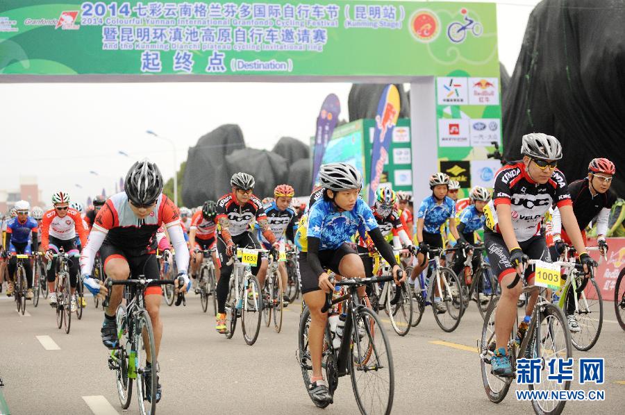 11月16日,选手们在比赛中出发。当日,“2014年七彩云南格兰芬多国际自行车节”在云南省昆明市鸣枪开赛。除了300余名参加全部五个赛段的选手外,还有700余名当地自行车爱好者也参与了昆明站的比赛。新华社记者胡超摄