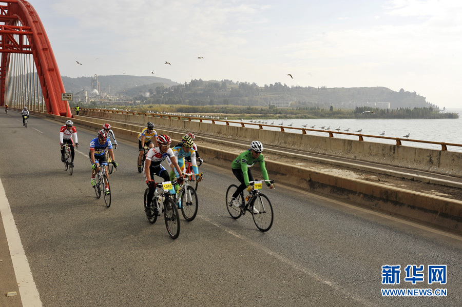 11月16日,在云南昆明,选手们在比赛中沿着环绕滇池的赛道骑行,身边偶尔有海鸥飞过。