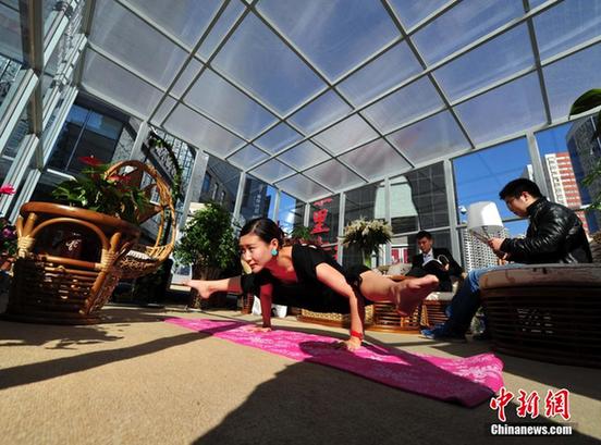 11月14日,河北石家庄庄里街入口处,一间全透明的玻璃房引来了不少市民围观。这间玻璃房是某企业为倡导全民环保,特意设置的新鲜空气“体验房”。志愿者们在体验房中做瑜伽、拉小提琴、看杂志,吸引民众进房体验,感受新鲜空气。据悉,体验房中配备了4台空气净化器,大量绿植以及氧气机和一些休闲设施,让市民感受到室内清新空气和室外有雾霾空气的差异,唤醒全民的环保意识。图为民众在玻璃小屋体验。中新社发 翟羽佳 摄