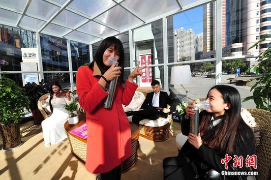 11月14日,河北石家庄庄里街入口处,一间全透明的玻璃房引来了不少市民围观。这间玻璃房是某企业为倡导全民环保,特意设置的新鲜空气“体验房”。志愿者们在体验房中做瑜伽、拉小提琴、看杂志,吸引民众进房体验,感受新鲜空气。据悉,体验房中配备了4台空气净化器,大量绿植以及氧气机和一些休闲设施,让市民感受到室内清新空气和室外有雾霾空气的差异,唤醒全民的环保意识。图为玻璃小屋。中新社发 翟羽佳 摄
