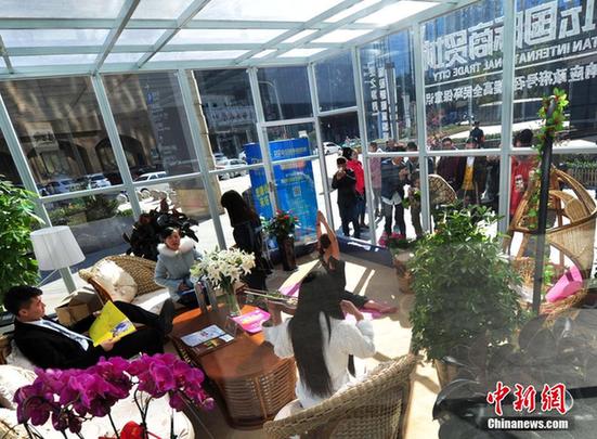11月14日,河北石家庄庄里街入口处,一间全透明的玻璃房引来了不少市民围观。这间玻璃房是某企业为倡导全民环保,特意设置的新鲜空气“体验房”。志愿者们在体验房中做瑜伽、拉小提琴、看杂志,吸引民众进房体验,感受新鲜空气。据悉,体验房中配备了4台空气净化器,大量绿植以及氧气机和一些休闲设施,让市民感受到室内清新空气和室外有雾霾空气的差异,唤醒全民的环保意识。图为民众走进玻璃小屋体验。中新社发 翟羽佳 摄