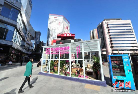 11月14日,河北石家庄庄里街入口处,一间全透明的玻璃房引来了不少市民围观。这间玻璃房是某企业为倡导全民环保,特意设置的新鲜空气“体验房”。志愿者们在体验房中做瑜伽、拉小提琴、看杂志,吸引民众进房体验,感受新鲜空气。据悉,体验房中配备了4台空气净化器,大量绿植以及氧气机和一些休闲设施,让市民感受到室内清新空气和室外有雾霾空气的差异,唤醒全民的环保意识。图为玻璃屋。中新社发 翟羽佳 摄