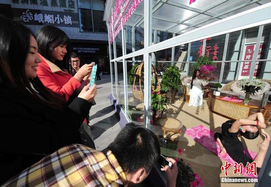 11月14日,河北石家庄庄里街入口处,一间全透明的玻璃房引来了不少市民围观。这间玻璃房是某企业为倡导全民环保,特意设置的新鲜空气“体验房”。志愿者们在体验房中做瑜伽、拉小提琴、看杂志,吸引民众进房体验,感受新鲜空气。据悉,体验房中配备了4台空气净化器,大量绿植以及氧气机和一些休闲设施,让市民感受到室内清新空气和室外有雾霾空气的差异,唤醒全民的环保意识。图为过往市民为小屋拍照。中新社发 翟羽佳 摄