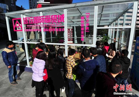11月14日,河北石家庄庄里街入口处,一间全透明的玻璃房引来了不少市民围观。这间玻璃房是某企业为倡导全民环保,特意设置的新鲜空气“体验房”。志愿者们在体验房中做瑜伽、拉小提琴、看杂志,吸引民众进房体验,感受新鲜空气。据悉,体验房中配备了4台空气净化器,大量绿植以及氧气机和一些休闲设施,让市民感受到室内清新空气和室外有雾霾空气的差异,唤醒全民的环保意识。图为玻璃小屋吸引民众。中新社发 翟羽佳 摄
