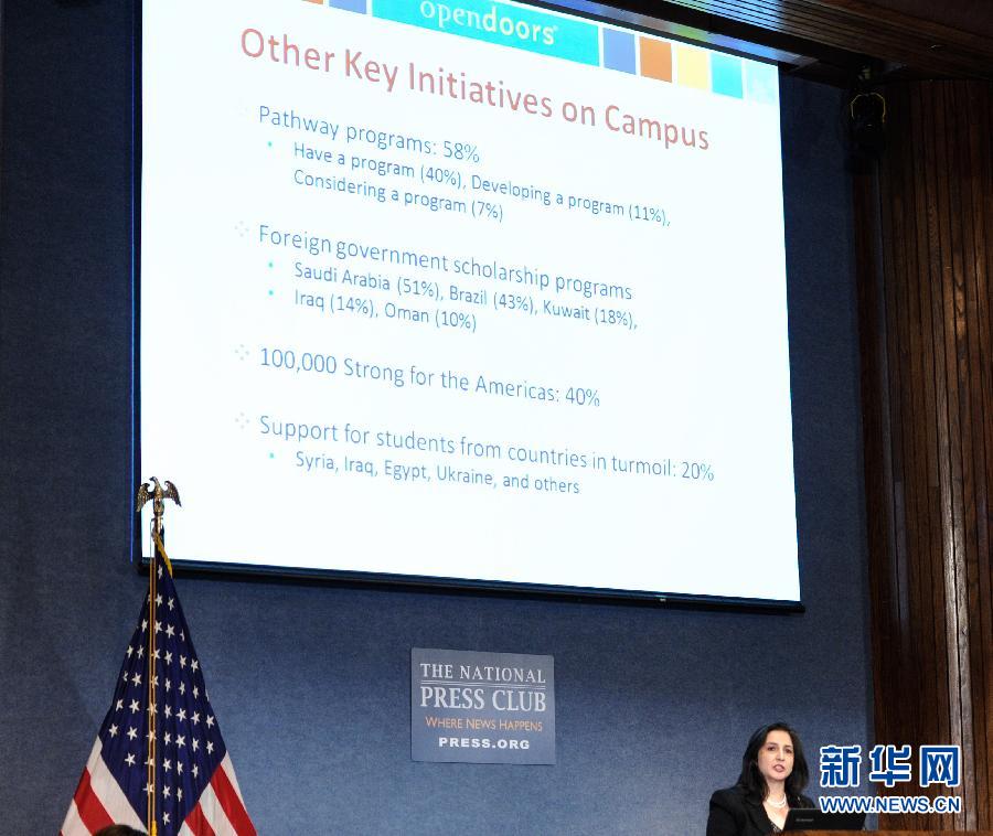 11月17日,在美国首都华盛顿,美国国际教育学会研究及评估副总裁拉伊卡·班达里在2014年度《门户开放报告》发布会上讲话。美国国际教育学会17日发布2014年度《门户开放报告》,总结美国国际教育交流情况。报告显示,2013-2014学年中国大陆在美大学留学生比上一学年增长16.5%,达到27.4万人,是在美国际学生的头号来源地。新华社记者鲍丹丹摄