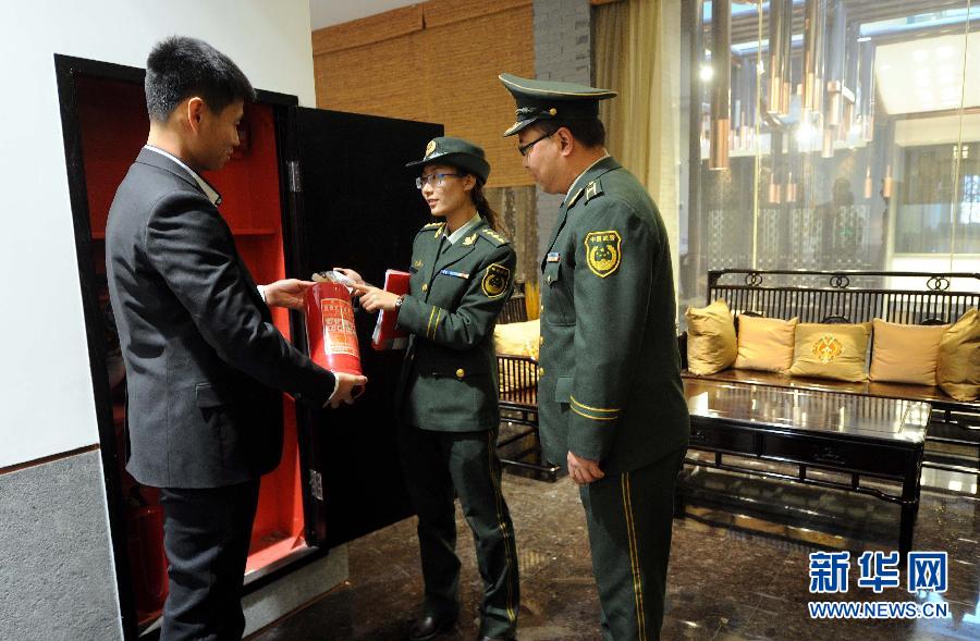 11月17日,河北大城县公安消防大队在红木文化产业新城内检查室内消防器材。为进一步加强广大群众消防安全意识,预防火灾事故的发生,河北大城县公安消防大队近日在红木文化产业新城组织开展灭火救援实战演练活动,并开展消防大检查,进一步筑牢红木古典家具产业基地的消防安全“防火墙”。新华社记者李晓果摄