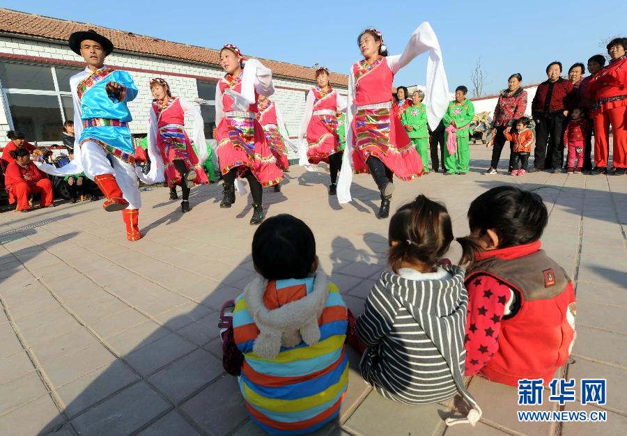 11月17日,“歪哥舞蹈队”在为村民表演节目。河北大城县“歪哥舞蹈队”是一支有28个成员的农村文化娱乐队,2011年正式成立。除了领队刘歪材,其余成员全部是喜好文娱的农村家庭妇女,年龄从30多岁到近60岁。他们多次义务参加农村各类文艺演出,不收取任何费用,每支舞蹈、每首歌曲都自编自演,《母女逛新村》《夫妻夸党员》等节目多次荣获市、县级奖项。新华社记者 李晓果 摄