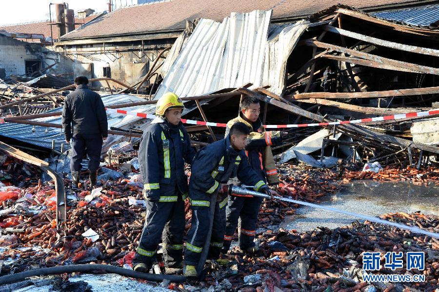 11月17日,消防队员在清理火灾现场。当日,山东寿光火灾事故现场扑救结束。11月16日晚7时,山东寿光龙源食品有限公司一胡萝卜包装车间发生火灾,事故已致18人死亡,13人受伤。新华社记者 范长国 摄