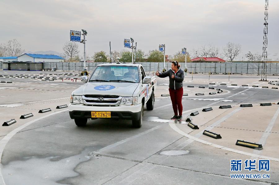 11月16日,手语老师在秦皇岛市公安交警支队车管所场地驾驶练习场帮助教练给聋哑学员讲解驾驶动作要领。 新华社记者杨世尧摄