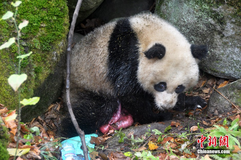 11月17日,四川青川唐家河国家级自然保护区工作人员在开展冬季生态监测的过程中,发现一只受伤野生大熊猫,这只大熊猫躲在一处花岗岩石穴内不断探出头发出呻吟声。经工作人员初步观察,该大熊猫为一只约3岁的亚成体大熊猫,腹部严重受伤伴有部分肠管外漏。经过当地医生和成都大熊猫繁育研究基地的兽医共同努力,该大熊猫被成功救治。医生还对其进行麻醉缝了100多针。目前,该大熊猫生命体征正常。图为受伤的大熊猫。中新社发 马文虎 摄