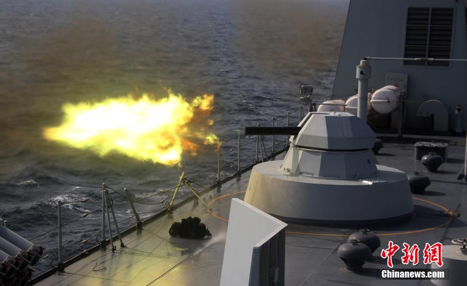 当地时间11月17日,中国海军第十八批护航编队长白山舰在亚丁湾东部海域,组织对海主、副炮实弹射击和施放干扰弹训练,展开了一场实战背景条件下综合攻防演练,进一步提升了舰艇远海防御作战能力。中新社发 严斌 摄