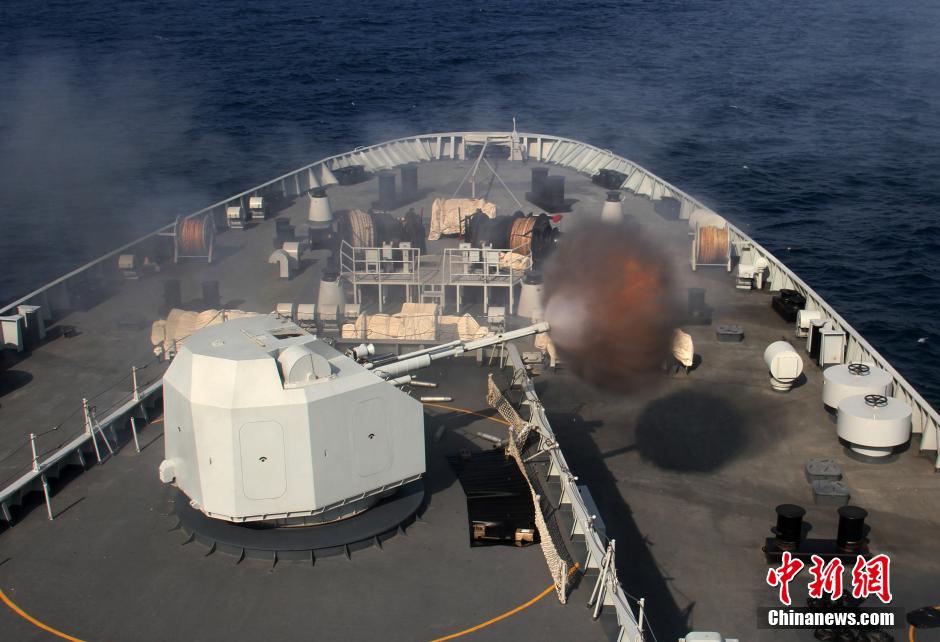 当地时间11月17日,中国海军第十八批护航编队长白山舰在亚丁湾东部海域,组织对海主、副炮实弹射击和施放干扰弹训练,展开了一场实战背景条件下综合攻防演练,进一步提升了舰艇远海防御作战能力。中新社发 严斌 摄
