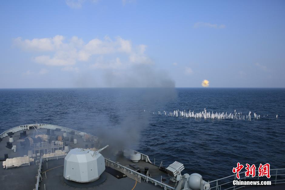 当地时间11月17日,中国海军第十八批护航编队长白山舰在亚丁湾东部海域,组织对海主、副炮实弹射击和施放干扰弹训练,展开了一场实战背景条件下综合攻防演练,进一步提升了舰艇远海防御作战能力。中新社发 孙海潮 摄