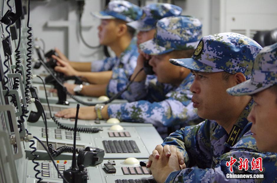 当地时间11月17日,中国海军第十八批护航编队长白山舰在亚丁湾东部海域,组织对海主、副炮实弹射击和施放干扰弹训练,展开了一场实战背景条件下综合攻防演练,进一步提升了舰艇远海防御作战能力。图为长白山舰副舰长杨国顺组织主、副炮对海射击目标捕捉、指挥。中新社发 肖永 摄