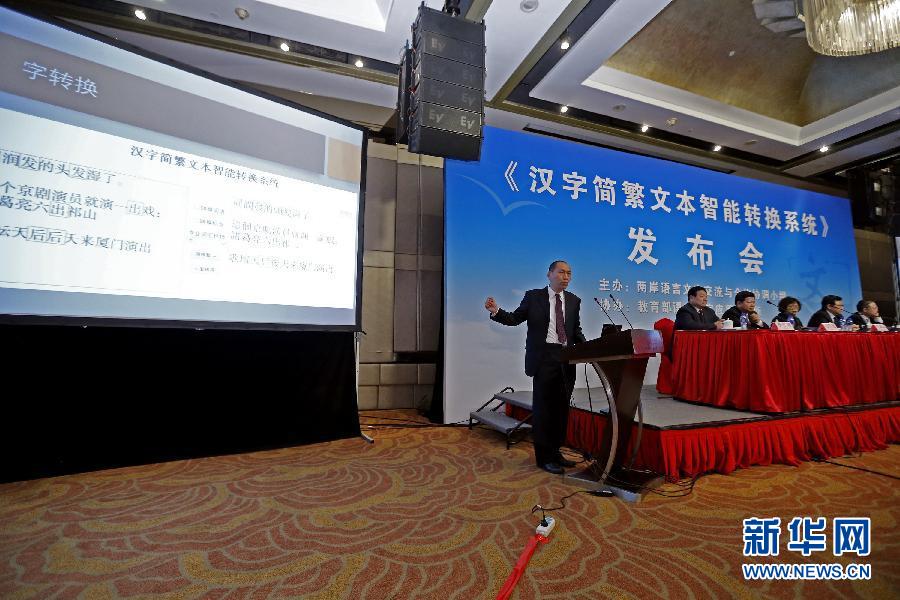 11月18日,厦门大学教授史晓东(左一)在发布会上介绍项目成果。当日,《汉字简繁文本智能转换系统》在北京正式发布,并将免费供社会使用。该系统能够进行面向中国台湾和面向古籍的两种简繁转换,克服了同类软件在“一简对多繁”转换情况下的不足;可同时进行字、词、专业术语、标点符号等多种转换,还提供了网站全部网页转换功能。经中国中文信息学会评测,该系统在字级别简体到繁体的转换准确率达到99.99%。相关专家认为,该系统转换准确率高、功能丰富、性能稳定,研究成果处于国际领先水平。 2009年7月,在湖南长沙举行的第五届两岸经贸文化论坛上达成了关于两岸合作研发汉字文本简繁转换系统的共同建议。为落实论坛建议,教育部、国家语委于2012年底启动《汉字简繁文本智能转换系统》项目研发,由厦门大学、教育部语言文字应用研究所、北京师范大学联合承担。系统于2014年7月通过专家鉴定。新华社记者 沈伯韩 摄