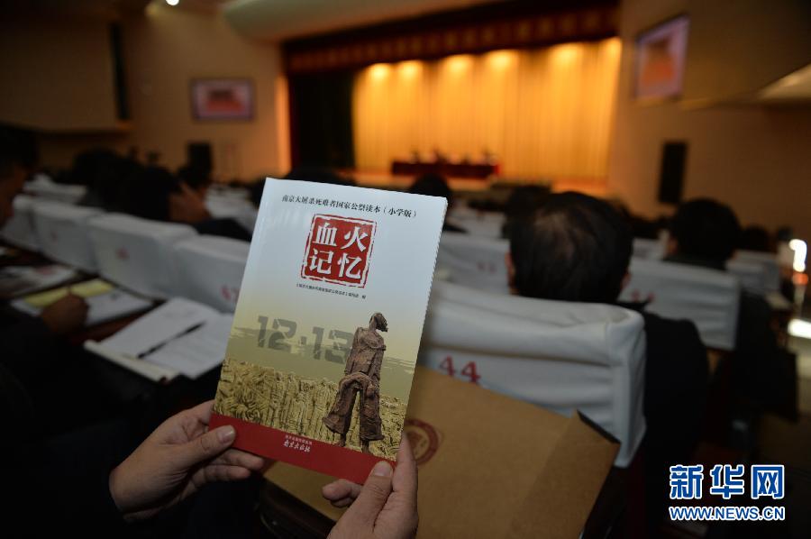 11月18日,培训现场使用的小学读本《血火记忆》。当日,《南京大屠杀国家公祭读本》使用培训在南京中华中学举行。来自南京市各辖区教育局和中小学近800名相关负责人参加了培训。为配合国家公祭日活动的开展,加强青少年学生南京大屠杀历史教育,南京市教育局组织了此次培训。南京各初中学校将结合课程设置和教学计划的整体安排,将公祭读本课程的实施纳入学校学期课程计划的目标设定、过程评估和结果考核中。《南京大屠杀死难者国家公祭读本》包括《血火记忆》《历史真相》《警示思考》三册,分别供小学、初中、高中学生阅读和学习。新华社记者 沈鹏 摄