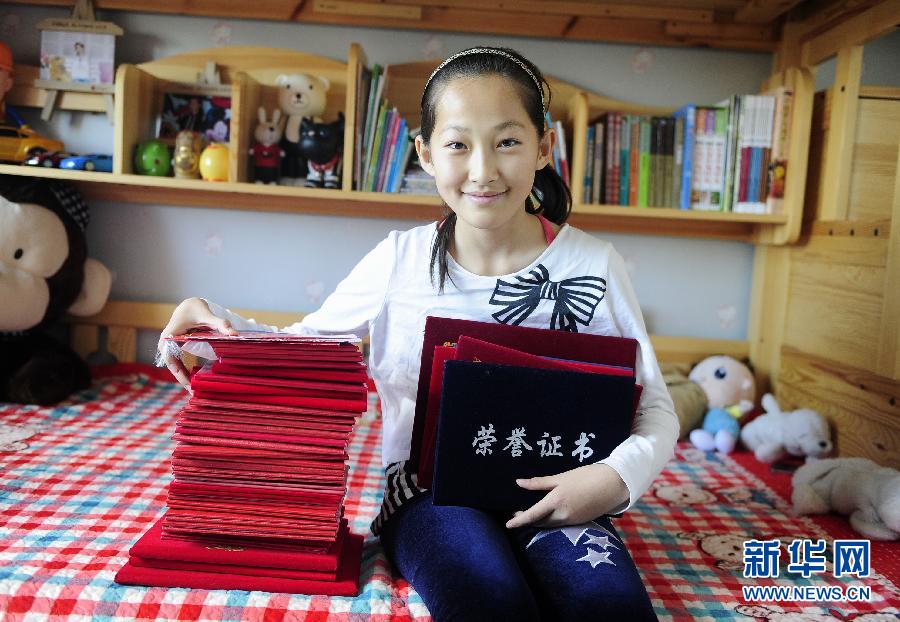 娜荷芽在展示她获得过的大大小小的荣誉证书(11月12日摄)。娜荷芽是内蒙古锡林浩特市蒙古族第二小学六年级学生。2009年国际儿童日前夕新华社曾报道过她的英语梦。如今,娜荷芽已经获得全国青少年英语口语大赛金奖及最佳表现奖。老师说她不光英语好,汉语也学得好。娜荷芽说:“人生必须要有规划,没有规划就没有前途。”她说,自己的课余时间和周末都会做规划,既有学习的时间,也有玩的时间。谈及梦想,她说,长大后要上哈佛大学,将来要到大学讲台讲哲学。新华社记者 邵琨摄