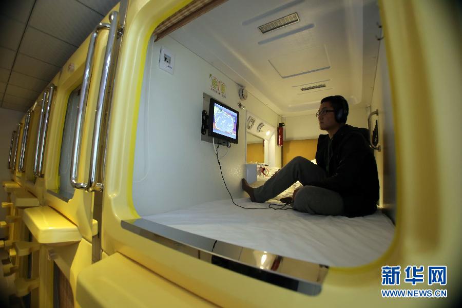 11月17日,在河南开封首家太空舱宾馆,一位年轻人正在舱内观看电视。这家太空舱宾馆目前已正式开业迎宾,宾馆分为睡眠区、休闲区、行李区、卫浴区四部分,前来住宿的客人以学生、旅行者及求职的年轻人居多。新华社发(李俊生 摄)