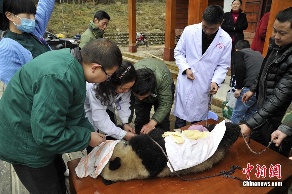 11月17日,四川青川唐家河国家级自然保护区工作人员在开展冬季生态监测的过程中,发现一只受伤野生大熊猫,这只大熊猫躲在一处花岗岩石穴内不断探出头发出呻吟声。经工作人员初步观察,该大熊猫为一只约3岁的亚成体大熊猫,腹部严重受伤伴有部分肠管外漏。经过当地医生和成都大熊猫繁育研究基地的兽医共同努力,该大熊猫被成功救治。医生还对其进行麻醉缝了100多针。目前,该大熊猫生命体征正常。图为工作人员正在营救野生大熊猫。中新社发 马文虎 摄