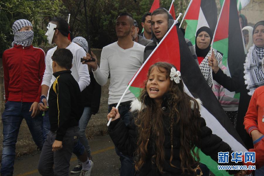 10月30日,8岁的巴勒斯坦女孩詹娜·杰哈德(中)在约旦河西岸一巴勒斯坦村庄抗议以色列修建犹太人定居点。 “我的梦想是上哈佛大学、学新闻,然后成为一名作家和记者。”詹娜·吉哈德淡定地说,表情严肃。詹娜今年8岁,刚上小学三年级,但已是巴勒斯坦地区的名人。从5岁半起,她用母亲的智能手机拍摄发生在身边的故事,然后发布在社交网络上。巴以冲突、示威游行、犹太人定居点扩建等,都成为这名“小记者”的报道主题。詹娜与母亲和外婆住在约旦河西岸的巴勒斯坦村庄里,不远处有一个犹太人定居点,进出村庄都需要经过以色列军队设立的检查站。为了抗议以色列兴建定居点,村民几乎每周五都会举行游行,并经常与以军发生冲突。詹娜在上学的路上有时也会被以军检查站阻止通行。遇到这种情况,她只能缺课。