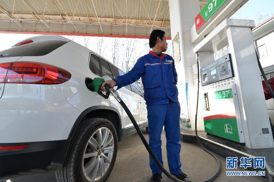 11月14日,河北保定一家加油站的工作人员在为汽车加油。当日,国家发展改革委发出通知,决定将汽、柴油价格每吨分别降低190元和180元,测算到零售价格90号汽油和0号柴油(全国平均)每升分别降低0.14元和0.15元,调价执行时间为11月14日24时。新华社记者 朱旭东 摄