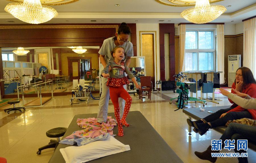 阿丽娜在医生的帮助下进行行走训练(11月11日摄)。今年6岁的阿丽娜是一位来自俄罗斯符拉迪沃斯托克的脑瘫儿童。10月27日,母亲娜莎带她来到中国鞍山市汤岗子医院进行为期一个月的康复治疗。这里治疗效果好,而且费用较为低廉,这已是她们第三次来中国进行康复治疗了。阿丽娜的脑瘫症状是在她6个月的时候,因为打疫苗发生反应而影响脑部发育造成的。在汤岗子医院,通过中药烘烤,脑循环治疗仪,泥疗和温泉疗养,中医按摩等治疗手段,阿丽娜的病情有所好转。据医生介绍,阿丽娜的腰肌力量有所增强,人也变得开朗乐观。阿丽娜喜欢看书,喜欢看动画片,喜欢玩偶,喜欢做过山车,还特别喜欢海豚,她希望有一天能和海豚做一次亲密接触。 新华社记者 杨青摄