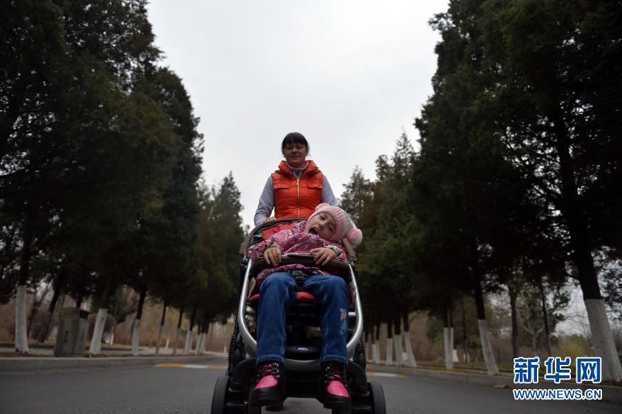 母亲娜莎推着阿丽娜在散步(11月11日摄)。今年6岁的阿丽娜是一位来自俄罗斯符拉迪沃斯托克的脑瘫儿童。10月27日,母亲娜莎带她来到中国鞍山市汤岗子医院进行为期一个月的康复治疗。这里治疗效果好,而且费用较为低廉,这已是她们第三次来中国进行康复治疗了。阿丽娜的脑瘫症状是在她6个月的时候,因为打疫苗发生反应而影响脑部发育造成的。在汤岗子医院,通过中药烘烤,脑循环治疗仪,泥疗和温泉疗养,中医按摩等治疗手段,阿丽娜的病情有所好转。据医生介绍,阿丽娜的腰肌力量有所增强,人也变得开朗乐观。阿丽娜喜欢看书,喜欢看动画片,喜欢玩偶,喜欢做过山车,还特别喜欢海豚,她希望有一天能和海豚做一次亲密接触。 新华社记者 杨青摄