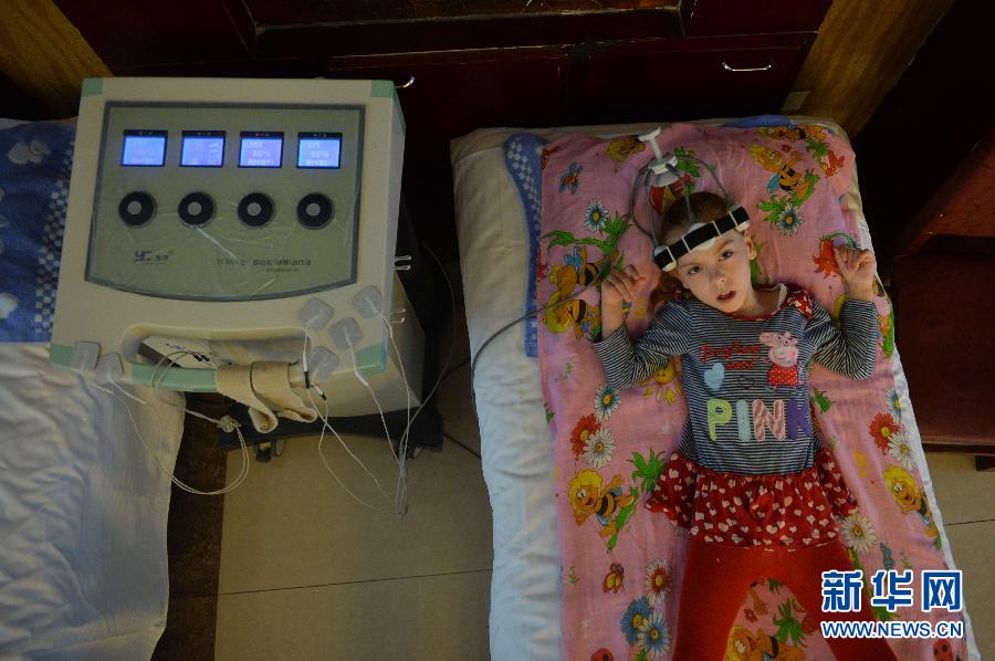 阿丽娜在接受脑循环治疗仪的治疗(11月12日摄)。今年6岁的阿丽娜是一位来自俄罗斯符拉迪沃斯托克的脑瘫儿童。10月27日,母亲娜莎带她来到中国鞍山市汤岗子医院进行为期一个月的康复治疗。这里治疗效果好,而且费用较为低廉,这已是她们第三次来中国进行康复治疗了。阿丽娜的脑瘫症状是在她6个月的时候,因为打疫苗发生反应而影响脑部发育造成的。在汤岗子医院,通过中药烘烤,脑循环治疗仪,泥疗和温泉疗养,中医按摩等治疗手段,阿丽娜的病情有所好转。据医生介绍,阿丽娜的腰肌力量有所增强,人也变得开朗乐观。阿丽娜喜欢看书,喜欢看动画片,喜欢玩偶,喜欢做过山车,还特别喜欢海豚,她希望有一天能和海豚做一次亲密接触。 新华社记者 杨青摄