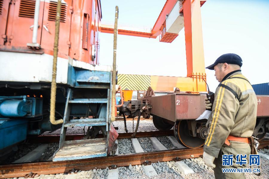 11月18日,工作人员在检查即将发车的首趟“义新欧”国际货运班列。