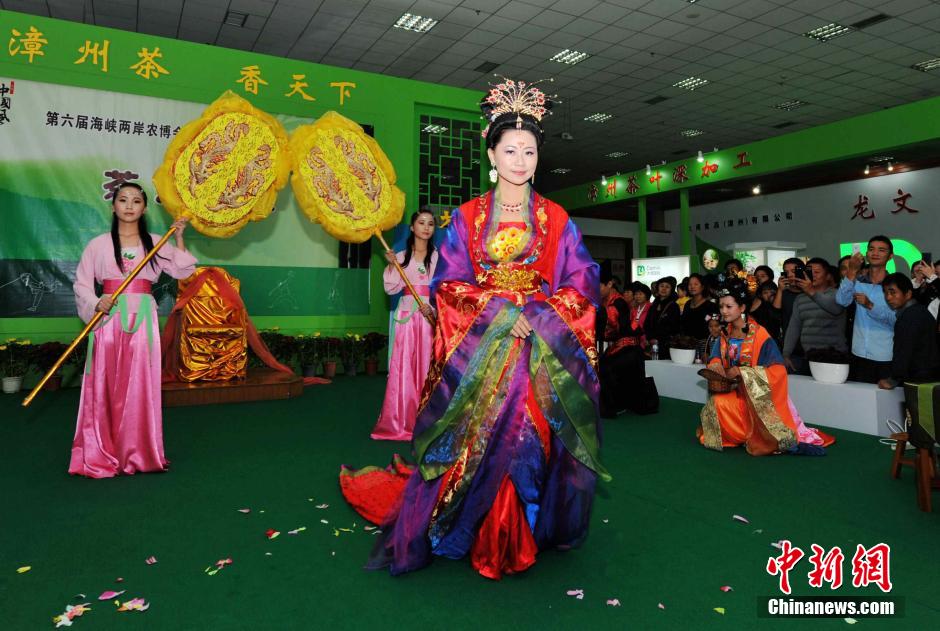 11月18日,在福建漳州第六届农博会上,一场独特的唐朝宫廷茶礼表演再现了中国悠久茶文化,吸引了许多市民驻足观赏。当日,以“花开两岸、合作双赢”为主题的“第六届海峡两岸现代农业博览会 第十六届海峡两岸花卉博览会”在漳州举行。 张斌 摄