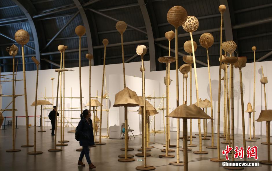 11月18日,参观者被展出的竹编作品吸引。当日,由当代艺术家邱志杰带来的《齐物》竹编作品展亮相南京艺术学院美术馆,近百件充满当代艺术元素感的竹编类作品铺满整个展厅,以奇特的形式令观众遐想。 中新社发 泱波 摄