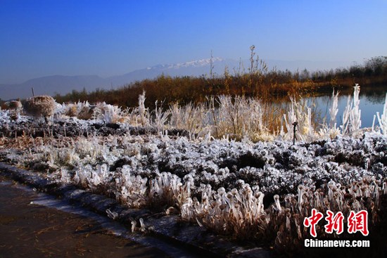 初冬时节,地处甘肃河西走廊的张掖最低温度已到零下8摄氏度,冬灌的水凝结在树木草丛上美丽“动人”。