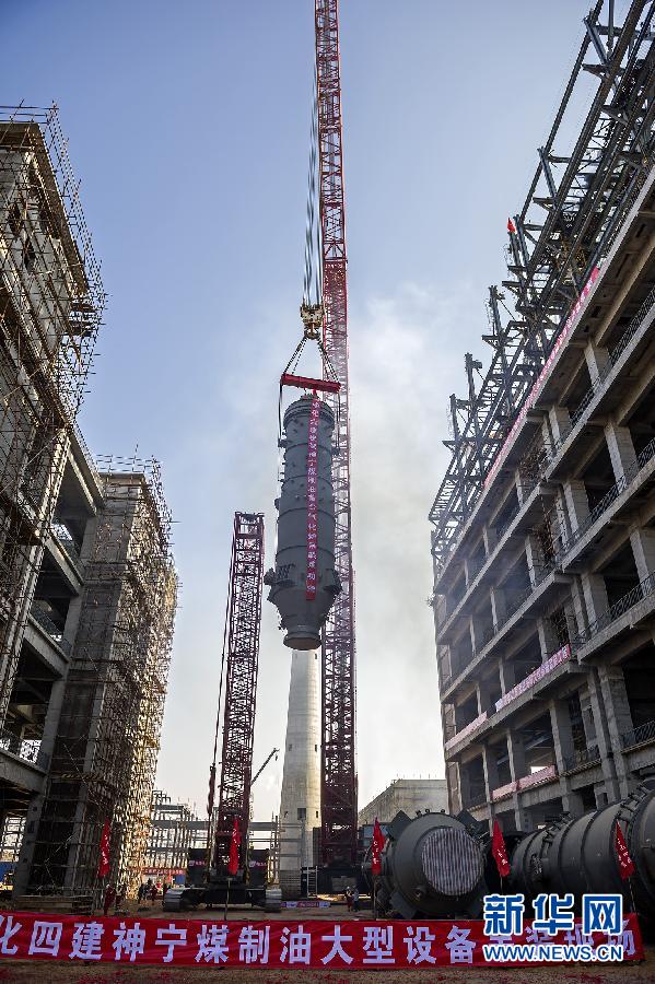 这是神华宁煤集团年产400万吨煤炭间接液化示范项目首台自主研发制造的气化炉吊装现场(11月18日摄)。当日,神华宁煤集团年产400万吨煤炭间接液化示范项目首台自主研发制造的气化炉完成吊装。该气化炉直径4.7米、高度21.6米,总重289.25吨,日投煤量为2200吨。该台气化炉由国内企业自主研发制造,此次吊装完成意味着气化炉在国内制造已取得重大突破,打破国外技术垄断,可有效带动煤化工行业重大技术和装备国产化,有效降低投资,提高效益。据了解,该项目概算总投资550亿元,计划2016年建成投产,是目前全球单套装置规模最大的煤制油项目。该项目以煤为原料,年转化煤炭2459.5万吨,年产合成油品405.2万吨,其中,调和柴油273.3万吨、石脑油98.3万吨、液化石油气33.6万吨。预计达产后年均销售收入266亿元。新华社记者 王鹏 摄