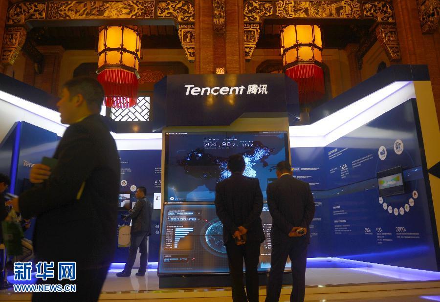 11月18日,观众在腾讯公司展台前参观。当日,首届世界互联网大会“互联网之光”主题展在浙江乌镇开幕。展览为期四天,集中展示中国互联网发展历程与成就,汇聚当前国内外互联网行业最新前沿技术与应用成果。新华社记者韩传号摄