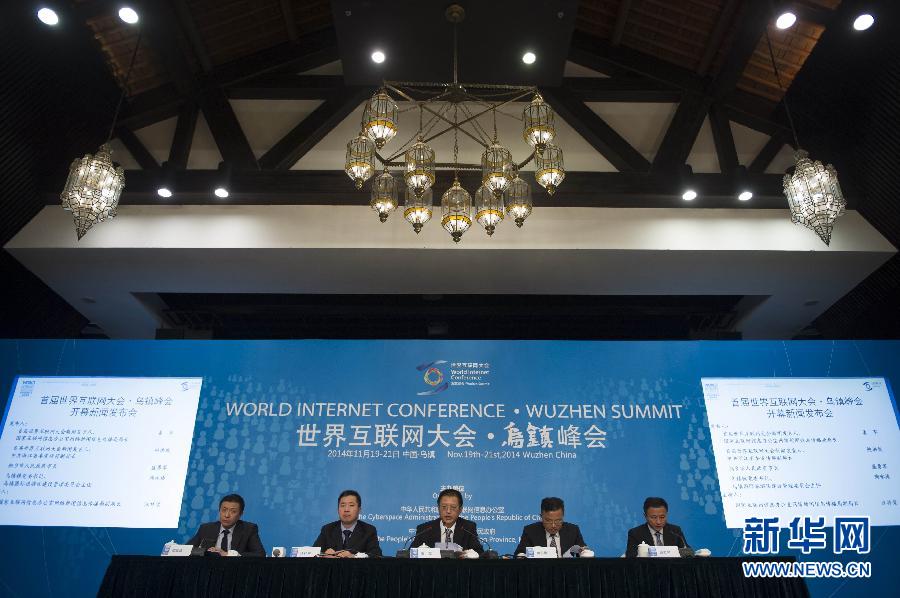 11月18日,首届世界互联网大会新闻发言人、国家互联网信息办公室网络新闻信息传播局局长姜军(中)介绍大会相关情况。当日,首届世界互联网大会举行开幕新闻发布会,首届世界互联网大会新闻发言人、国家互联网信息办公室网络新闻信息传播局局长姜军与首届世界互联网大会新闻发言人、中共浙江省委宣传部副部长鲍洪俊等出席并介绍相关情况。首届世界互联网大会将于11月19日至21日在中国浙江乌镇举行。新华社记者 鞠焕宗 摄