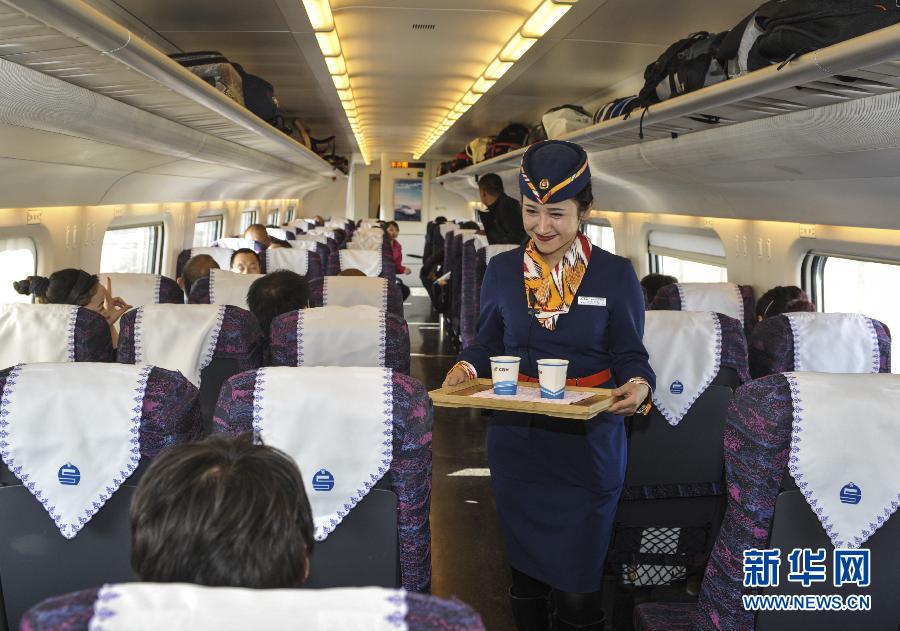 11月16日,地里达尔·阿不都拉正式成为一名“动姐”。在动车车厢里,不少旅客要求与她合影留念。“看到旅客很兴奋,我们也很高兴。” 预计今年年底,全长1776公里的兰新高速铁路将会全线通车。在这条目前世界上一次性建设里程最长的高速铁路上、在西部广袤的大地上,地里达尔·阿不都拉和她的同事们将会努力为旅客献上最优质的服务。“其实对于我们来说,最美的风景不是在车窗外,而是在车里!”“动姐”地里达尔·阿不都拉说。新华社记者 赵戈 摄