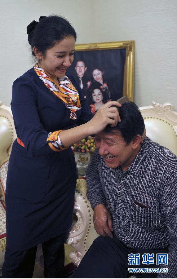 11月15日,回到家后,地里达尔·阿不都拉给父亲阿不都拉·尼亚孜梳头。在家里,阿不都拉·尼亚孜总爱问女儿工作上的事情。地里达尔·阿不都拉说,两代人都做客运工作,差别也挺大,但是服务的标准一点没变。 新华社记者 赵戈 摄