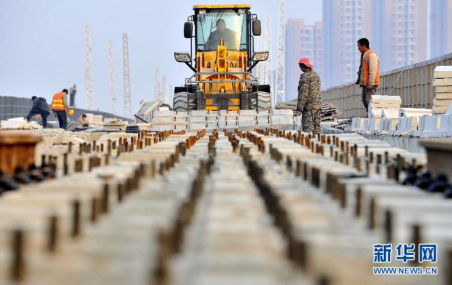 11月18日,工作人员在铺设水泥枕木。近日,由中铁六局天津铁建公司承建的津保高铁天津段工程进入铺设轨道阶段。津保铁路从天津西站至河北省保定站,线路全程157公里,共设7个车站,最高设计时速为250公里,2015年建成后,保定与天津间的运行时间将缩短至40分钟。新华社记者岳月伟摄
