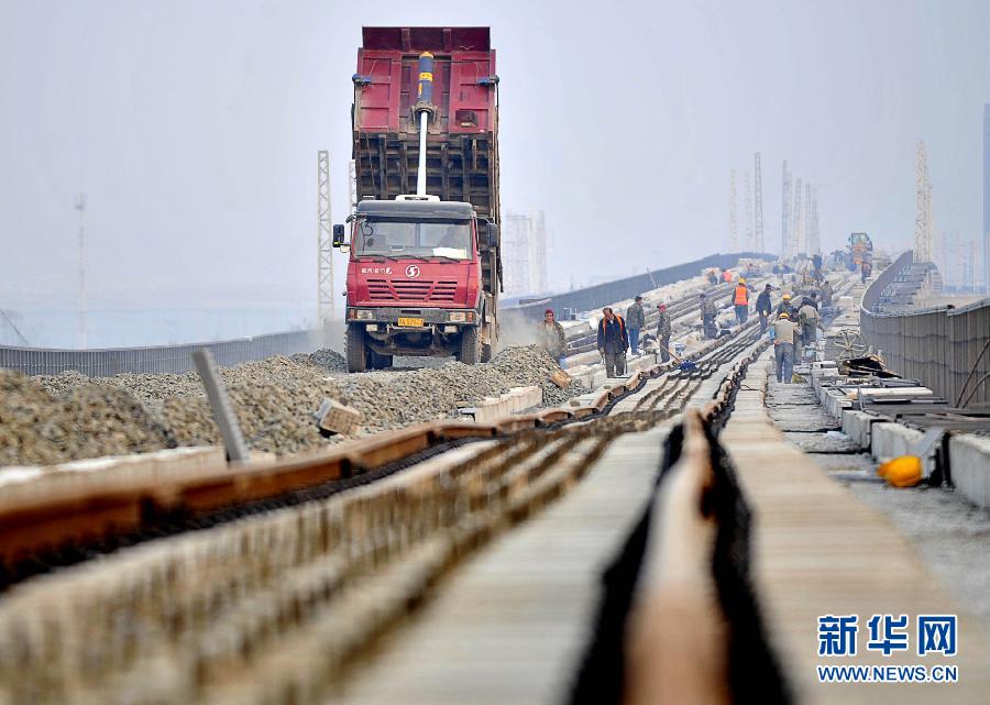 11月18日,一辆施工车在铁轨周围铺设石块。近日,由中铁六局天津铁建公司承建的津保高铁天津段工程进入铺设轨道阶段。津保铁路从天津西站至河北省保定站,线路全程157公里,共设7个车站,最高设计时速为250公里,2015年建成后,保定与天津间的运行时间将缩短至40分钟。新华社记者岳月伟摄