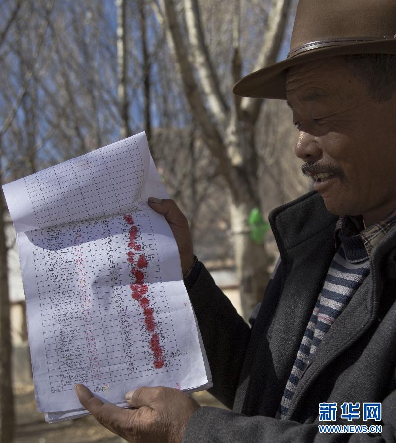 西藏堆龙德庆县德庆村村主任达瓦向记者展示村民免费领取良种的记录(11月12日摄)。西藏自治区农牧厅数据显示,2014年,西藏粮食播种面积252.37万亩,产量由2009年的90.53万吨增加至今年的98.5万吨,实现了“五连增”。实现粮食产量“五连增”,靠的是背后“一条龙”的惠农服务。新华社记者范世辉摄
