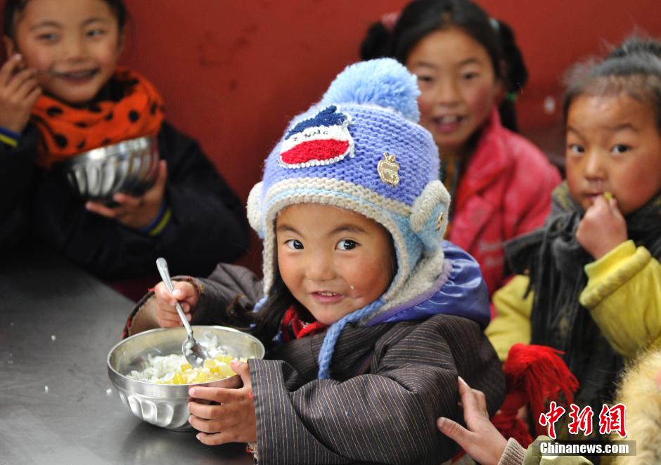 11月18日,记者来到四川省阿坝州壤塘县茸木达乡中心学校,探访这座高原小学师生们的生活。茸木达乡中心学校共有7个教学班,学生245名,教师23名,以藏语教学为主。开设了包括藏语文、藏数学、藏科学、藏美术、藏音乐、藏思想品德等课程。图为午餐中的学生们。中新社发 安源 摄