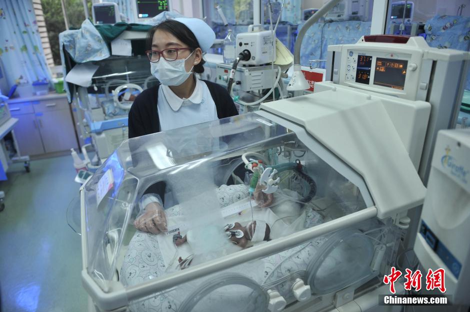 11月18日,重庆西南医院儿科监护室内医护人员正在为最小早产宝宝测量身高,尺子大概显示身高为30厘米左右,体重依然只有660克。近日,西南医院手术室里一孕妇因胎盘前置而大出血,在怀孕23周时被迫流产。但流产下来的女婴一声啼哭,震惊了手术室里的所有人,在呼吸机的帮助下,女婴生命体征已经稳定。医生表示,这名女婴应该是重庆目前出生最早的早产儿,如果她能活下来,将是生命的奇迹。陈超 摄