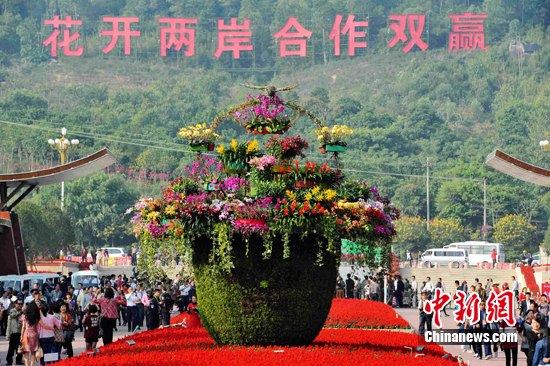11月18日,一高达十米左右的巨型花篮亮相漳州东南花都。当日,以“花开两岸、合作双赢”为主题的“第六届海峡两岸现代农业博览会·第十六届海峡两岸花卉博览会”在漳州举行。张斌 摄