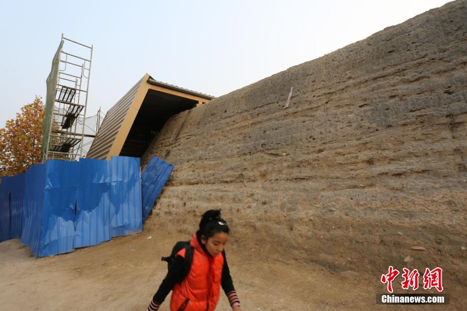 图为11月17日,一名放学的小学生从施工现场的城墙下走过。 杨正华 摄