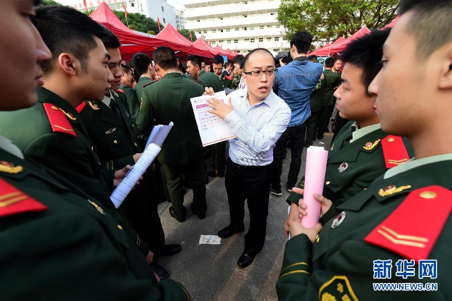 11月18日,一名企业代表(中)向临退老兵介绍用工情况。当日,深圳市70多家企业的负责人走进广东边防总队机动支队训练基地,为那里的300余名临退老兵举行专场招聘会。据悉,此次招聘会提供近1100个工作岗位,供老兵选择。新华社发(廖键 摄)
