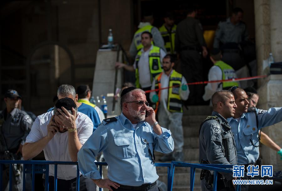 11月18日,在耶路撒冷西部哈尔诺夫区,以色列警察在遇袭的犹太教会堂附近警戒。 以色列警方18日说,耶路撒冷一个犹太教会堂当天早晨遭到袭击,造成4名犹太人死亡,两名袭击者被打死。 新华社记者李睿摄