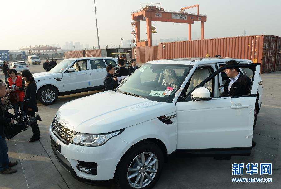11月18日,在郑州国际陆港联检中心,郑州海关和进出口检验检疫人员对进口路虎揽胜车进行查验通关。当日,两辆产自德国的路虎揽胜越野车经过22天的行程,由郑欧国际铁路货运班列运抵郑州,这两辆汽车将经过海关、进出口检验检疫联检通关后交付客户。这是郑州汽车整车进口口岸通过国家验收以来的首批进口整车,从此将有更多欧系汽车经新丝绸之路的郑欧班列进入中国内地。新华社记者赵鹏摄
