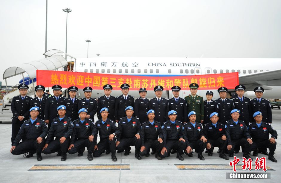 11月16日,中国第三支赴南苏丹维和警队的13名官兵结束在南苏丹为期一年的维和任务后返回成都。这支赴南苏丹维和警队由四川省公安厅组建,分别来自警卫、外事、法医、森林公安、政工、特警、交警、刑警、指挥中心、经侦等不同的警种岗位。图为维和警队抵达成都迎接仪式现场。中新社发 钟欣 摄